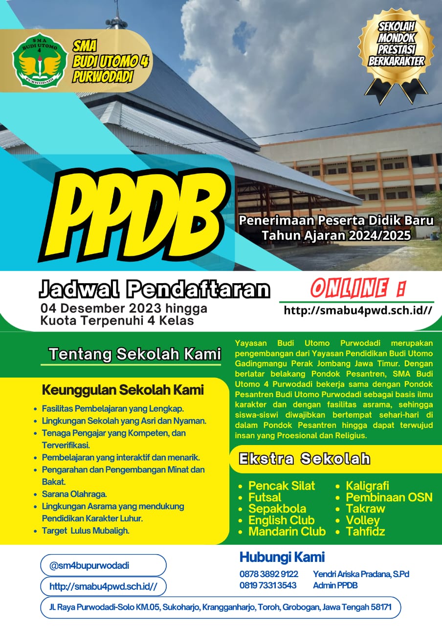 Berikut kami sampaikan Brosur PPDB Online SMA Budi Utomo 4 Purwodadi Tahun Pelajaran 2024/2025