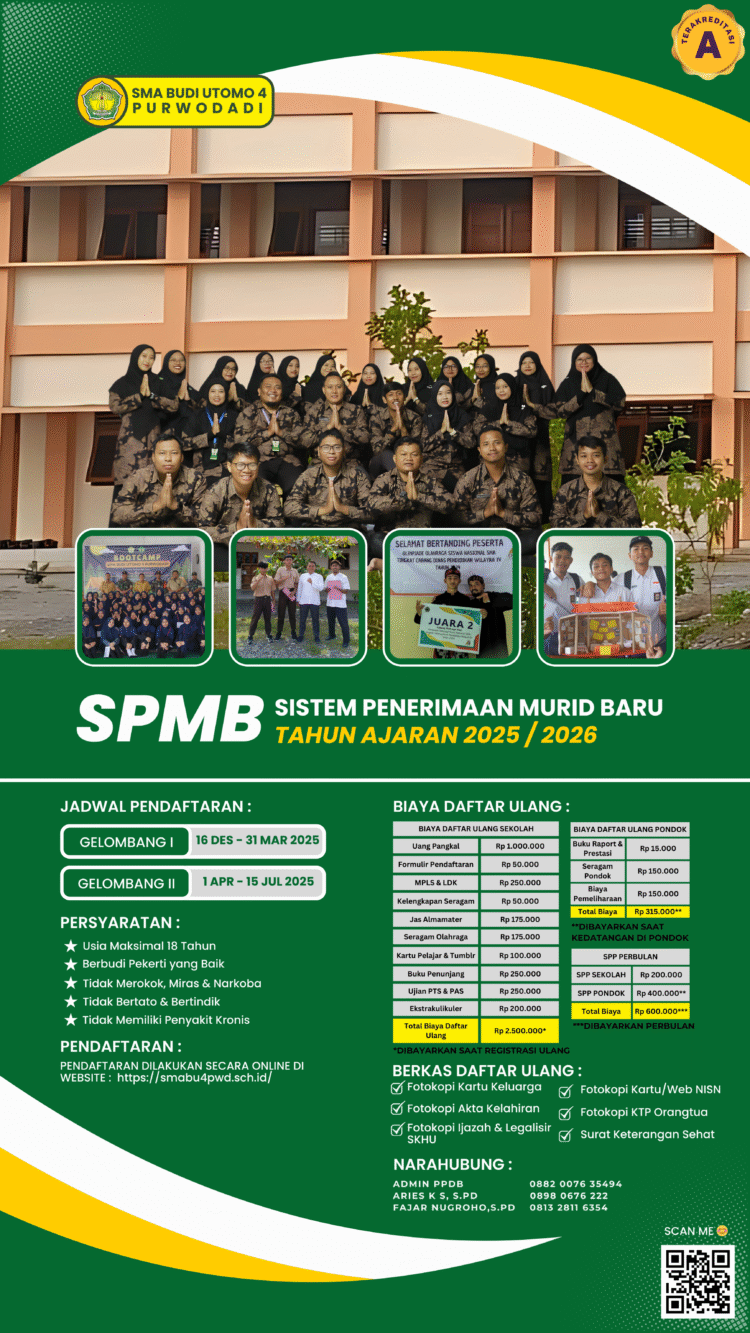 Berikut kami sampaikan Brosur PPDB Online SMA Budi Utomo 4 Purwodadi Tahun Pelajaran 2025/2026